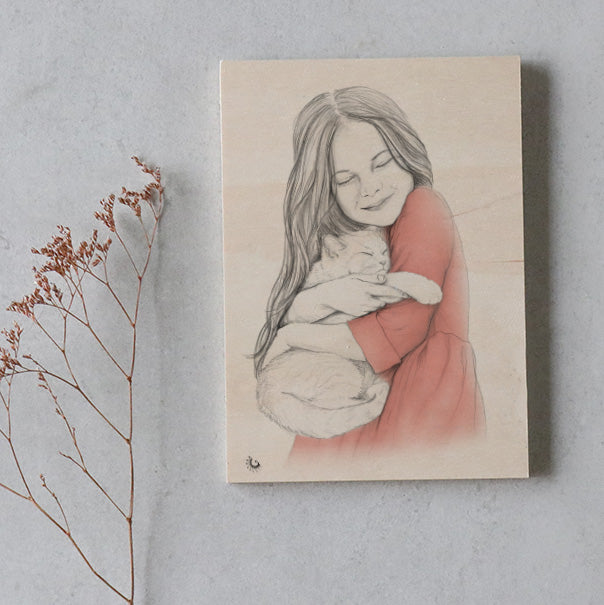 Drawing of a girl with a rabbit printed on wood